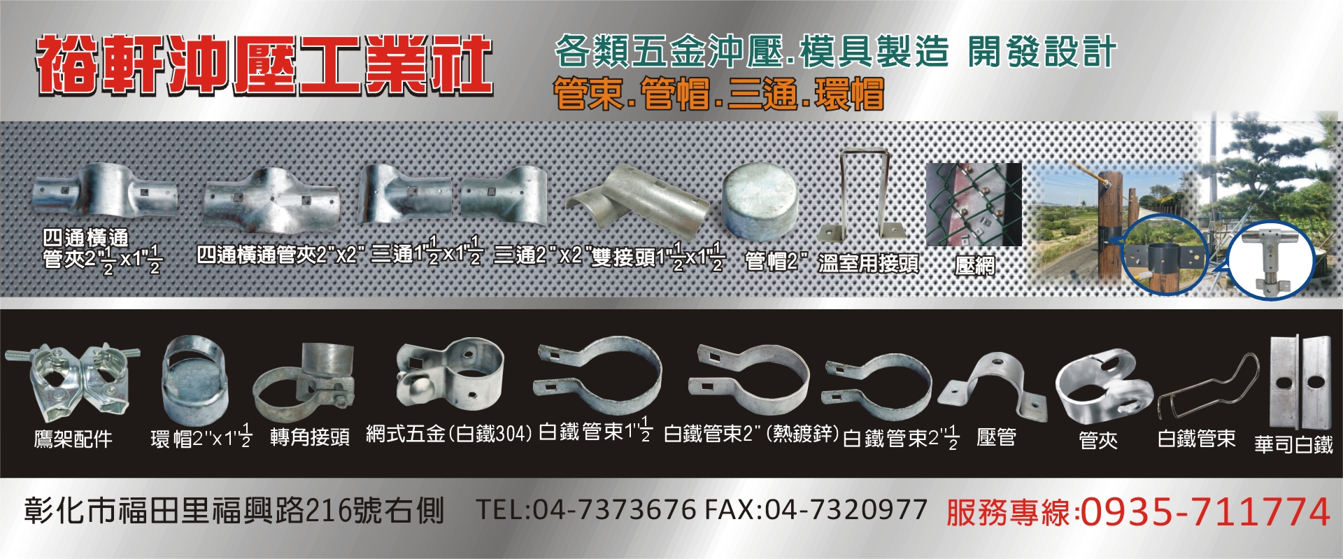 五金沖壓、五金模具製造、五金開發設計、五金材料、管束、水管束、管帽、三通、四通、環帽、卡車四鏡頭底座、四通橫通管夾、雙接頭、網室五金、白鐵管束、白鐵熱鍍鋅管束、溫室五金材料、溫室配件、菱型網五金、溫室五金、溫室五金配件、溫室材料、五金配件、各式沖壓、轉角、葫蘆夾、子母型管束、葫蘆束、管夾、白鐵熱鍍鋅、菱形網五金、各式五金沖壓、各式模具製造、各式模具開發、各式模具設計、彰化五金、彰化沖壓、彰化模具、彰化材料、彰化五金材料、彰化溫室、彰化菱型網、彰化五金配件、彰化溫室配件、三通接頭、溫室用接頭、轉角接頭、鷹架配件、壓管